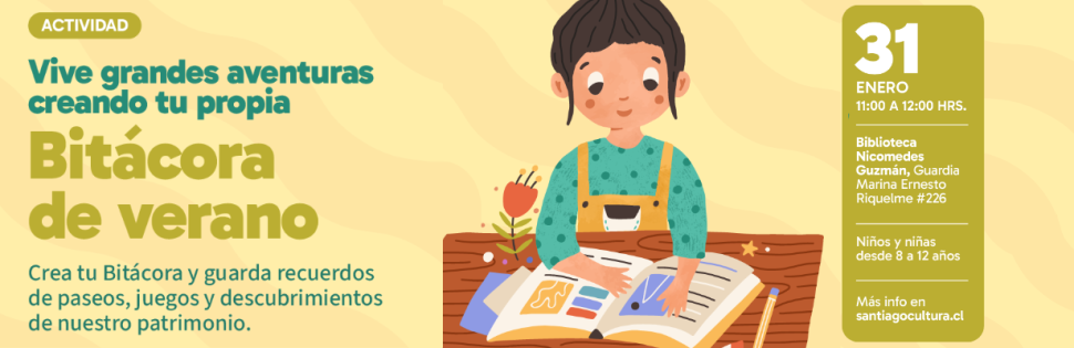 Las vacaciones de veranos son un periodo especial lleno de aventuras y experiencias y te invitamos a plasmarlas creando una bitácora de verano con nosotros en la Biblioteca Municipal Nicomedes Guzmán. La actividad está dirigida a niños y niñas de 8 a 12 años y se realizará el sábado 31 de enero a las 11:00 horas en la terraza de la biblioteca.